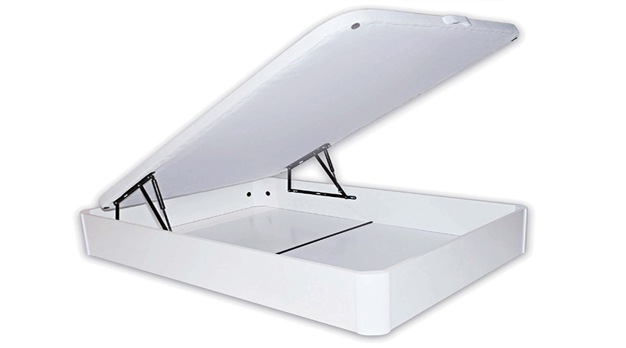 Tapa abatible con estructura metálica y tablero de 8mm. Tirador de madera de haya a juego con el color del canapé. Arco metálico sujeta colchón.
