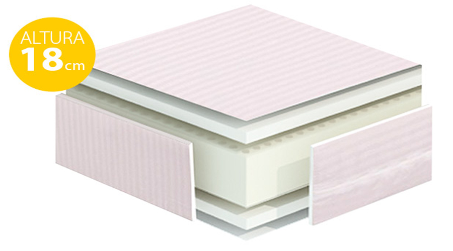 Combina en su núcleo, 3 cm por cada una de las caras, de látex Talalay Soft, (considerado como el mejor látex del mundo, por su fabricación 100% natural, así como por la mejora que supone con respecto a otros látex en cuanto a Transpiración, Adaptabilidad, una Elasticidad y Durabilidad) junto con 12 cm de látex Dunlop, 100% látex natural, exento de productos químicos nocivos para la salud en su fabricación.